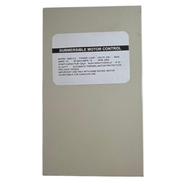 This 1.5kW Submersible Pump Control Box is designed for 230V single-phase motors, delivering a rated current of 10A and a maximum of 12.5A. It features a 45μF run capacitor and a 125μF start capacitor, along with built-in automatic thermal motor protection and an IP22 rating, making it ideal for dependable outdoor pump use.