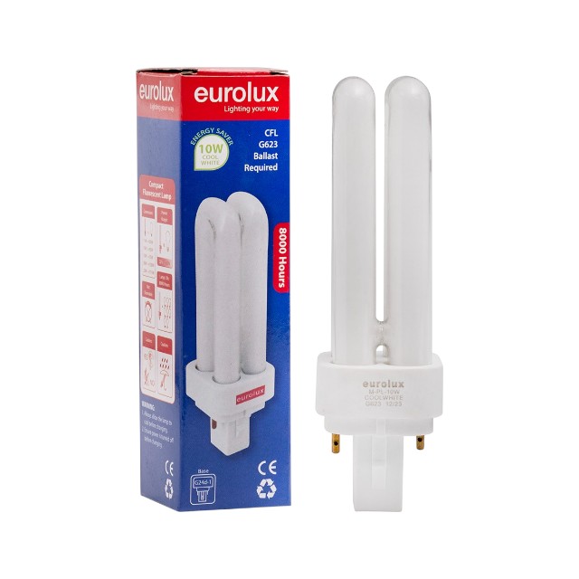 The 10W G24d CFL Fluorescent Bulb provides efficient cool white lighting with a compact 2-pin base design. It delivers 4000K illumination suitable for offices, shops, and household fixtures requiring reliable light output. With a long lifespan of up to 8,000 hours, this bulb ensures consistent performance and energy savings.