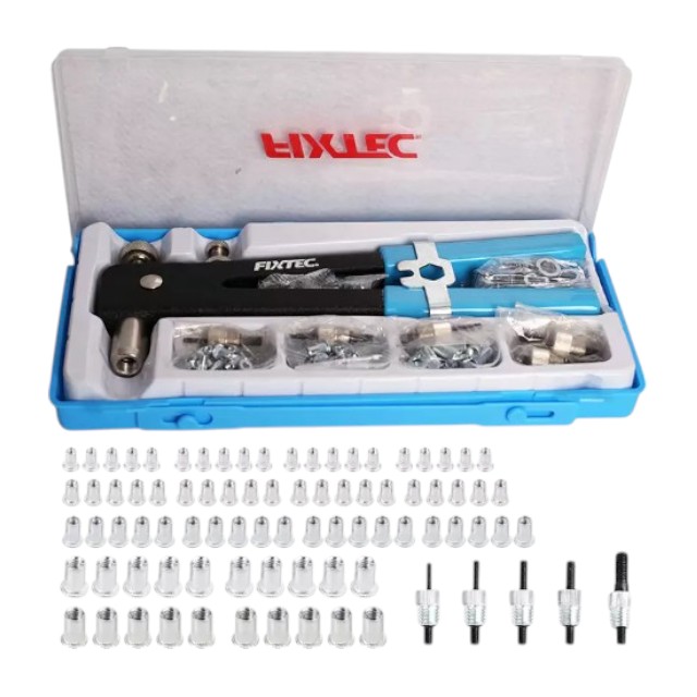 86-piece 11″ nut rivet gun set designed for secure fastening of threaded rivet nuts in various materials. Includes a heavy-duty rivet gun and a wide range of rivet nut sizes for versatile use in metalworking, automotive, and DIY projects. Ergonomic design ensures comfortable handling and reliable performance.